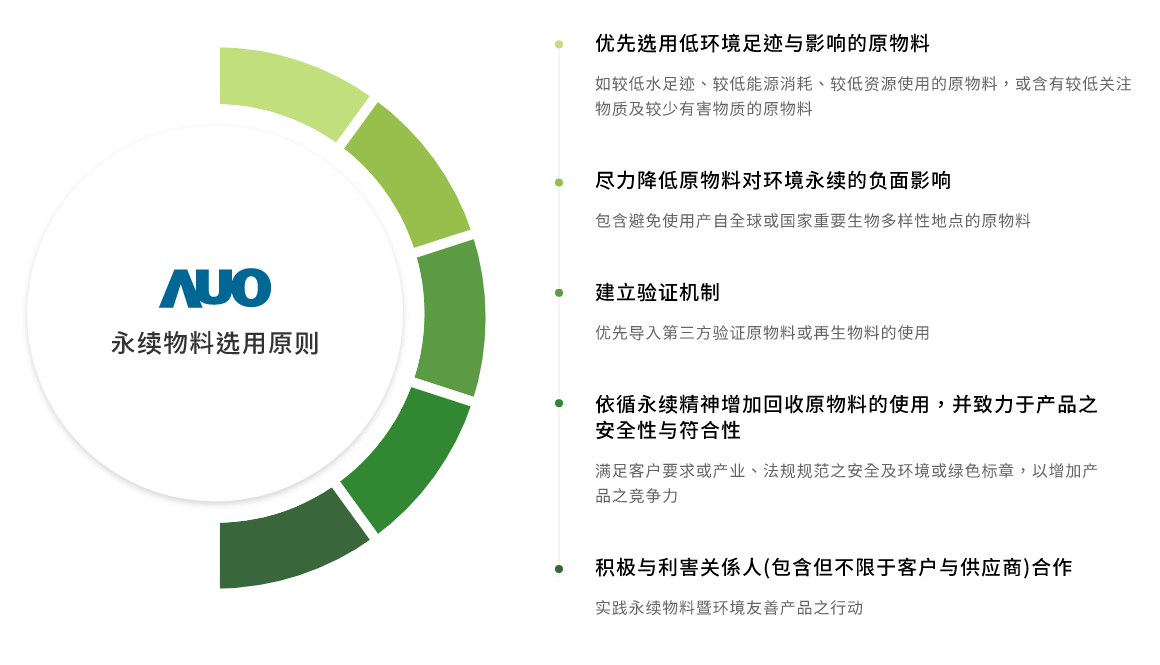 必一·运动(B-Sports)主要产品显示器面板,面板製造原物料主要使用为玻璃基板与半导体製程所製造之显示器液晶盒再与相关零件和物料组装。为选用低环境负荷与风险之原物料,我们于产品生命週期原物料阶段,即对我们所使用的原物料进行关键原物料之分析评估,包含材质以及重量占比。再依分析结果定义关键原物料,优先导入再生物料的使用。