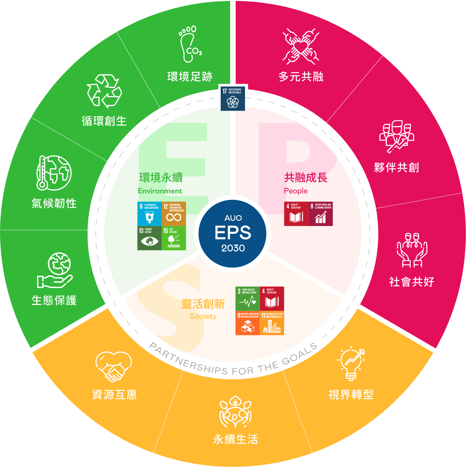 以2018至2025年的EPS實績為基礎,友達以EPS 2030展望未來,設下30項永續目標,持續開展企業永續實踐。我們將持續致力於降低環境衝擊與發展循環經濟,深化社會正向影響力,並透過創新研發,深化場域應用技術,開創人類生活嶄新可能,並攜手生態圈夥伴,邁向企業發展與地球永續的雙贏。